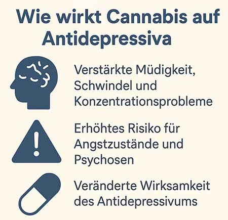 Die kombinierte Verwendung von Cannabis und Antidepressiva ist prinzipiell möglich. Die Anwendung sollte unter klarer Abwägung der Chancen und Risiken erfolgen. Folgende Interaktionen und Effekte spielen eine Rolle: